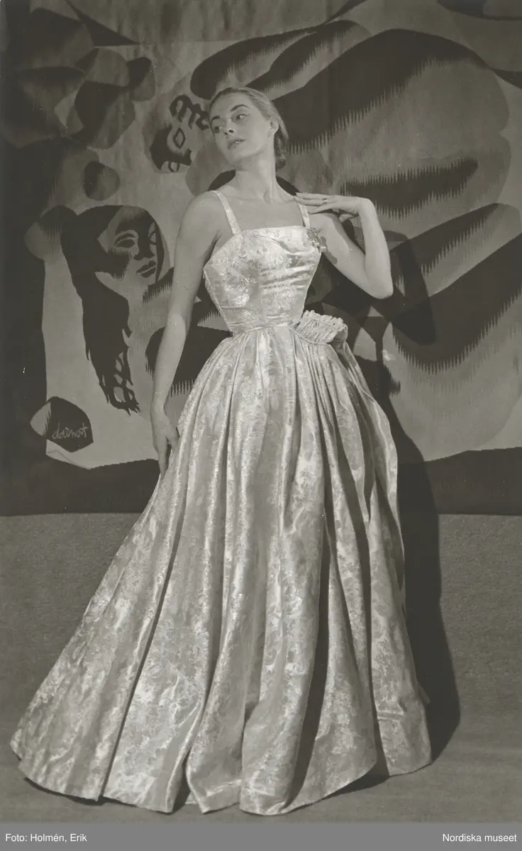 Modell i aftonklänning, framför textilkonstverk. Modell efter Madame Grès.