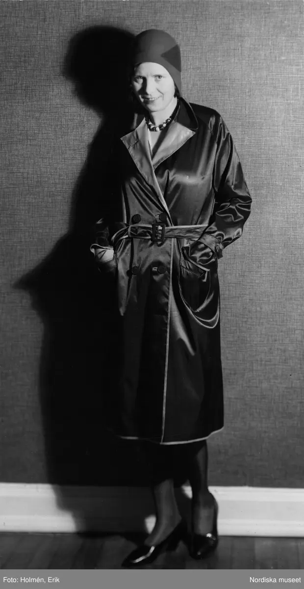 Modell klädd i regnkappa med skärp, pumps och klockhatt.