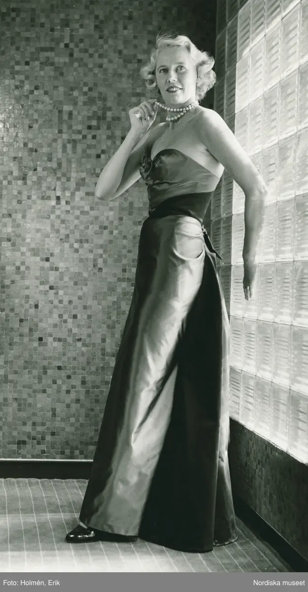 EM, Modellbutiken, Nordiska Kompaniet. Uppvisning i lunchrummet. Damkonfektion. Modell bär aftonklänning i svart- och petroleumfärgad duchesse.