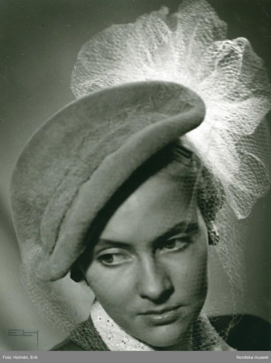 Porträtt av kvinna i velourhatt i "vieux rose" med rosa flor. Modell Maison Maria Guy.