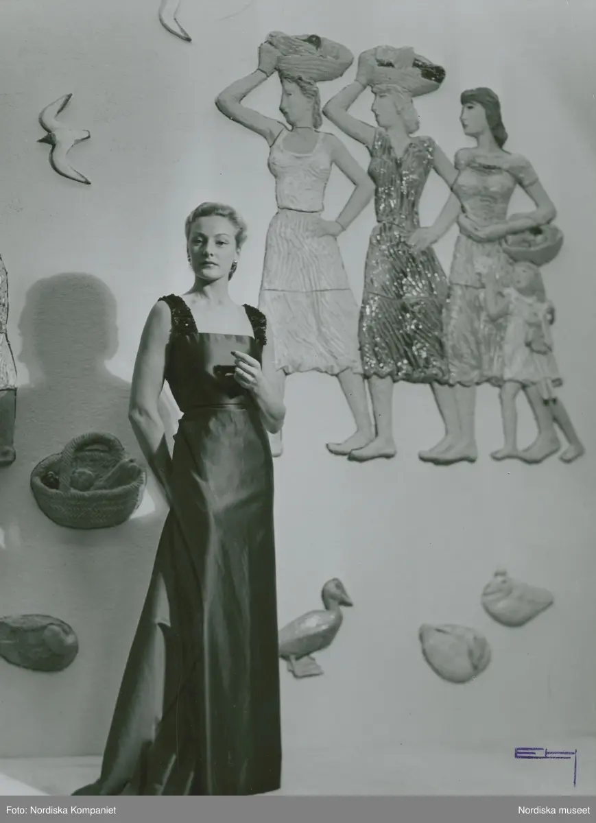 Modell i buteljgrön aftonklänning i blank helsilke med pärlbroderier på axelbanden, från Molyneux. Konst i bakgrunden.