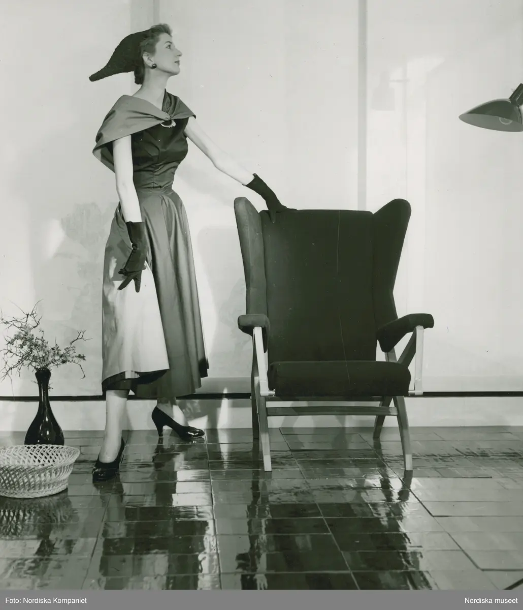 Modell i klänning med sjal och hatt, handskar och pumps, vid en fåtölj. "Italiana".