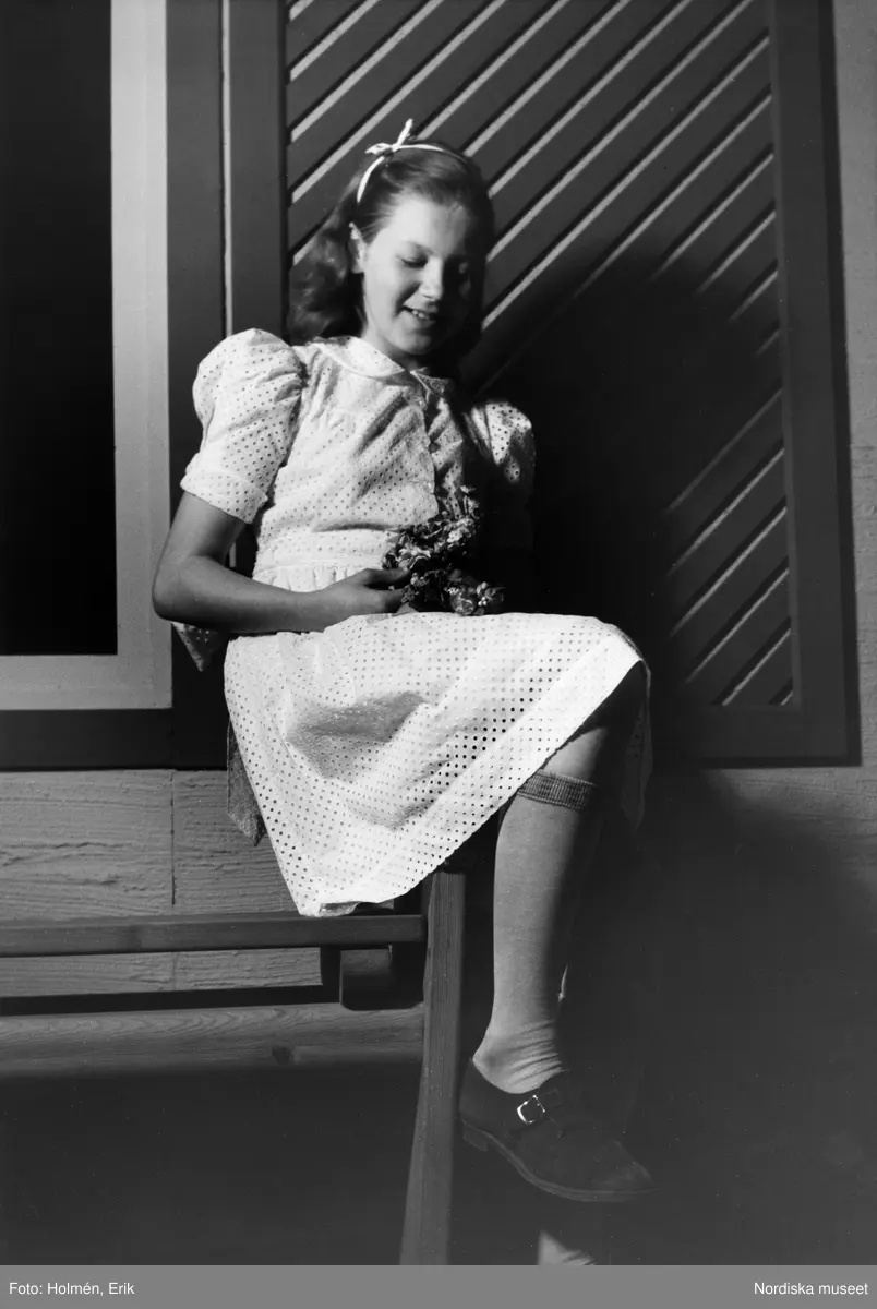 Flicka i vit klänning med puffärm, knästrumpor och mörka skor sitter på en bänk.