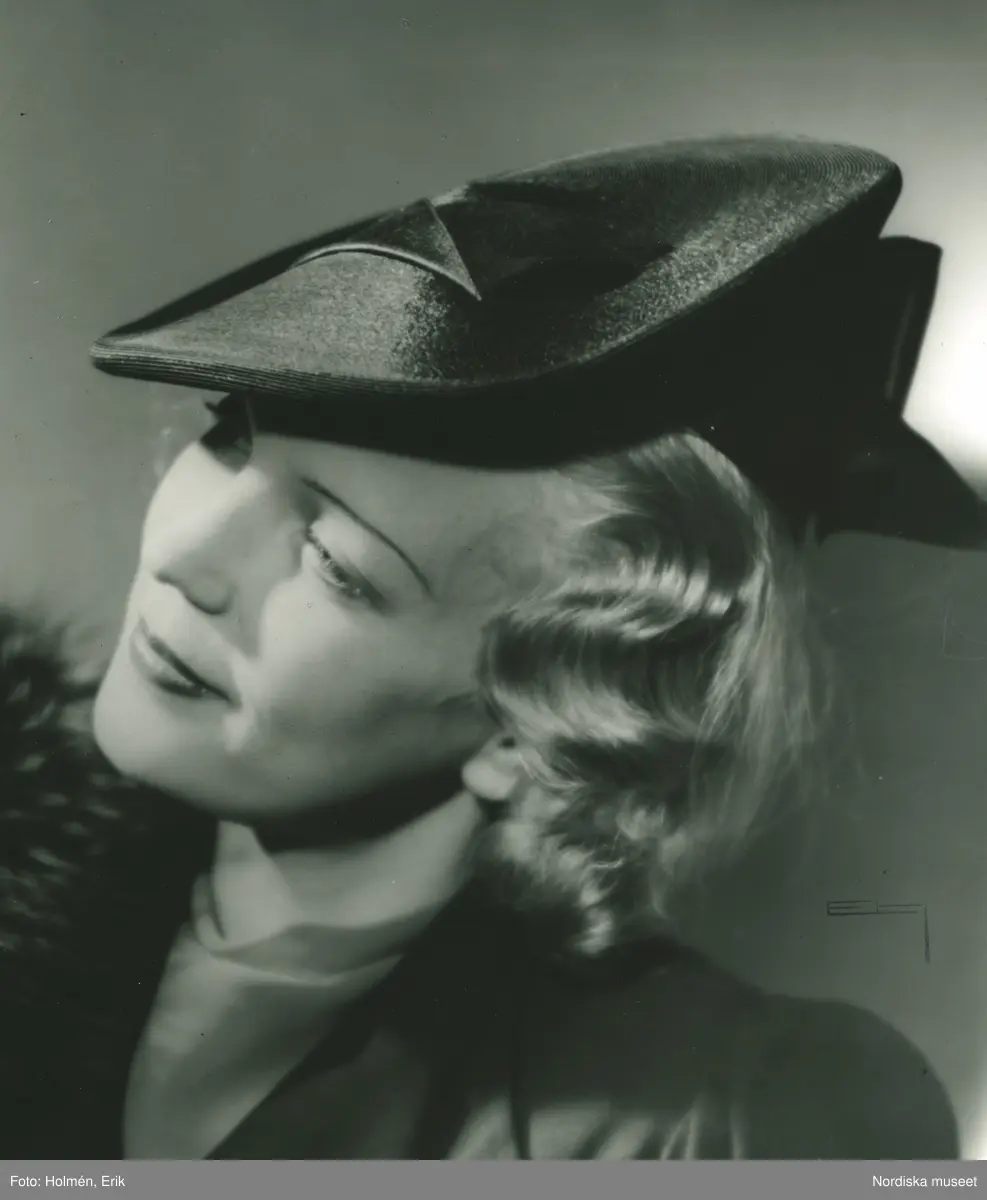 Fb, Porträtt av kvinna i hatt av Jeanne Lanvin. Svart stråhatt med garnering av svart blankt band.