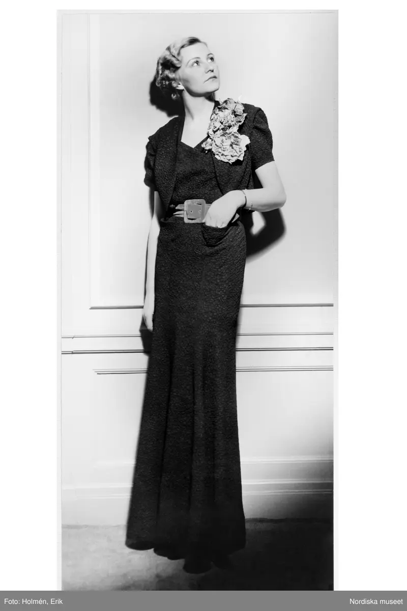 Mannekäng visar festklänning. Hellång klänning, figurnära med svagt utställd kjol, små fickor på magen och brett skärp. Över bär hon en kort jacka av bolerotyp, med kort puffärm och corsage vid ena axeln. NK:s Franska damskrädderi.