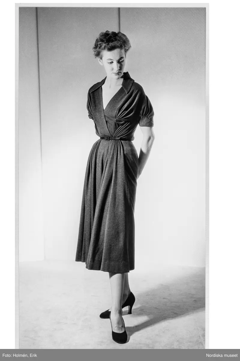 Mannekäng visar plagg på NK:s Franska damskrädderi. Klänning med omlottskuret liv och liten krage, kort puffärm och vadlång kjol. Intrikat sömnad med rynkor och draperingar, smalt skärp i midjan. Se även närbild av klänningen NMA.0099943.