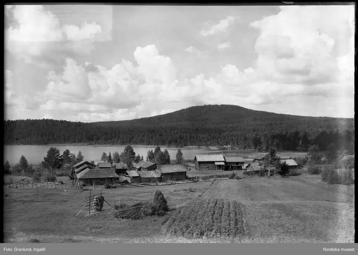 Vy över Mångbergs fäbodar på Sollerön i Dalarna. Byggnader inhägnade med gärdesgård, utanför står hässjor bredvid en odling.