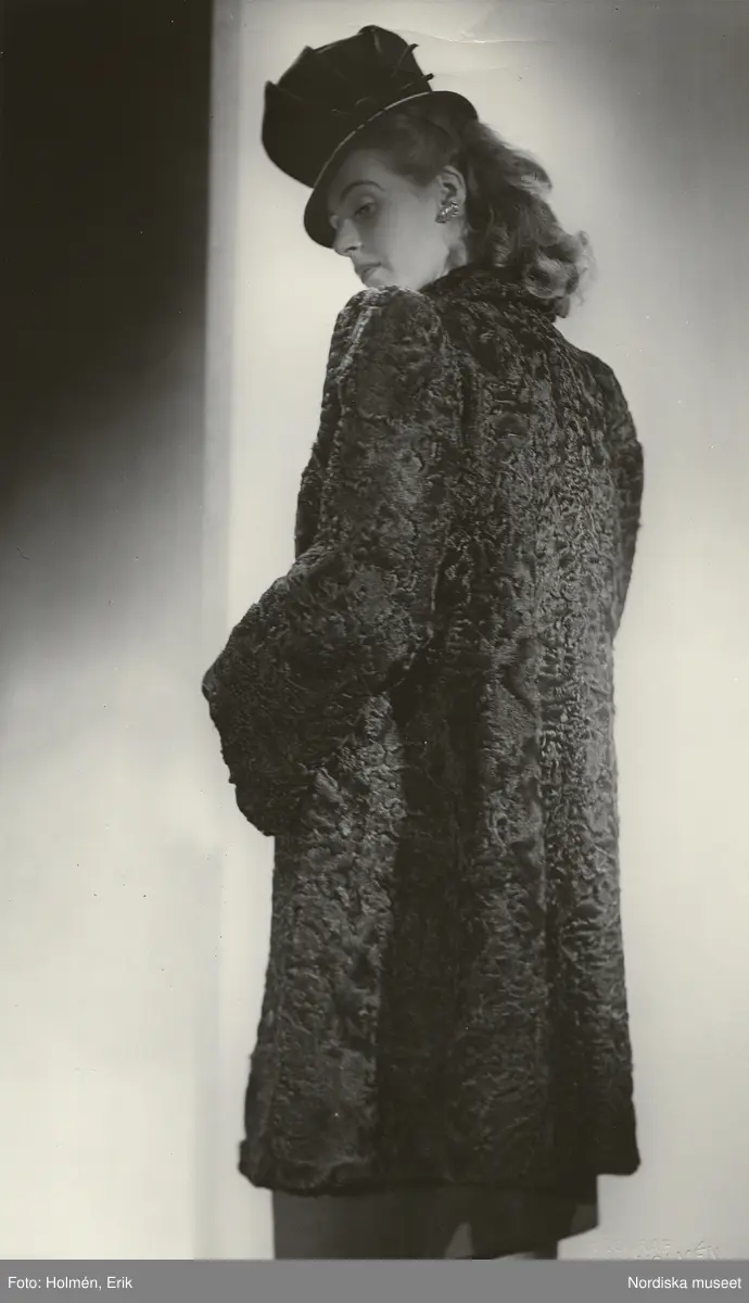 Nordiska Kompaniet. Kvinna i lårlång persianpäls. Mörk hatt med brätte och hög kulle.