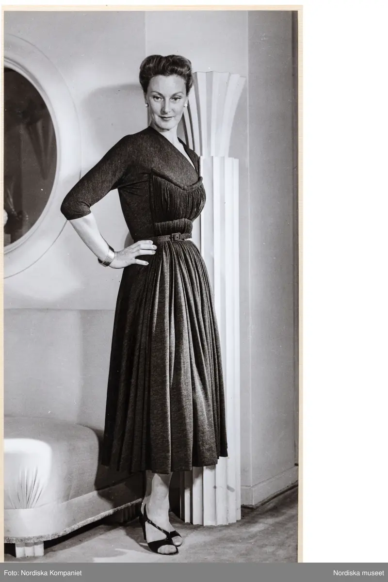 Mannekängen Margareta Berglund gift Nordlund (1946) visar höstplagg i provrummet vid NK:s Franska damskrädderi. Klänning med figurnära liv, sydd dekor vid bysten, trekvartslång ärm, markerad midja. Vadlång kjol med mjuka veck. Remsandaletter.