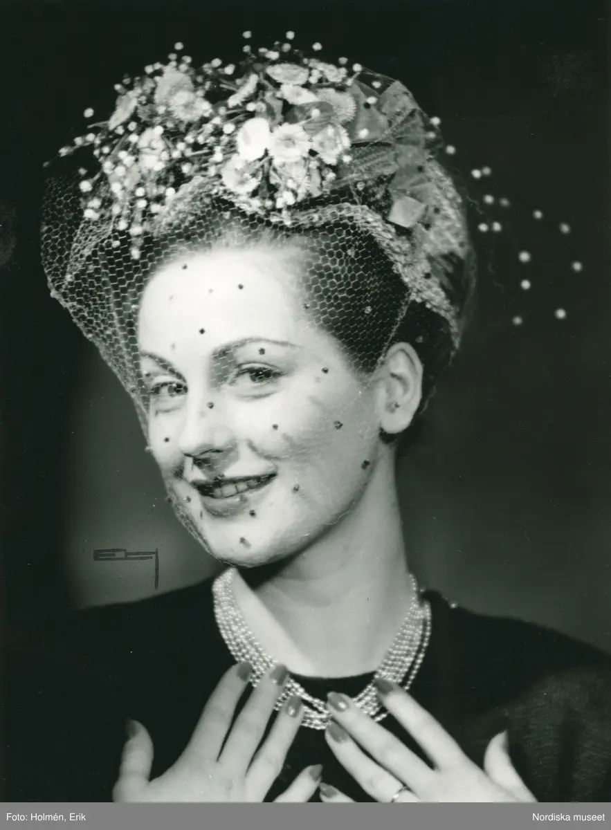 Porträtt av kvinna i stråhatt med garnering och flor i grönt och rosa. Uppvisning mars 1947. Hattar använda vid franska avdelningen.