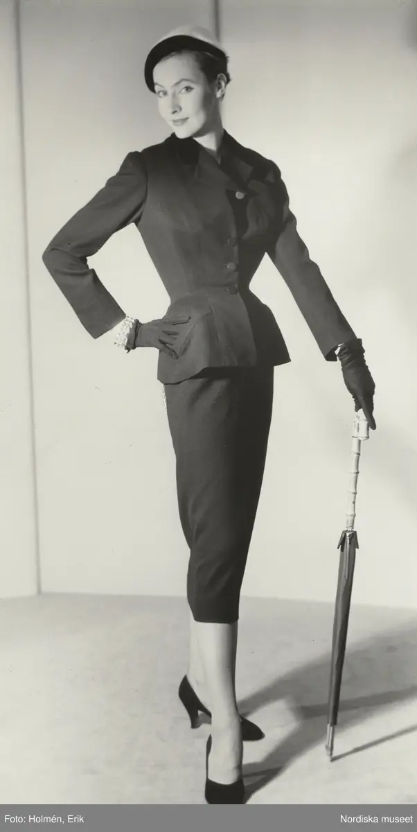 Modell i dräkt, handskar, hatt och pumps med paraply i handen. Från Balmain.