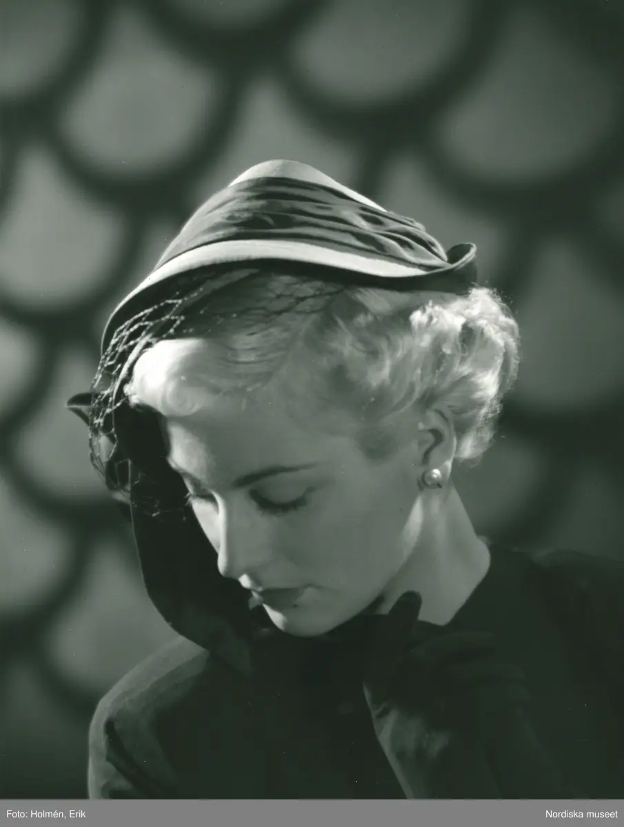 Porträtt av kvinna med lackröd stråhatt med marinblå bandgarnering, underbrättet överklätt med marinblå taft, av Simone Cange.
