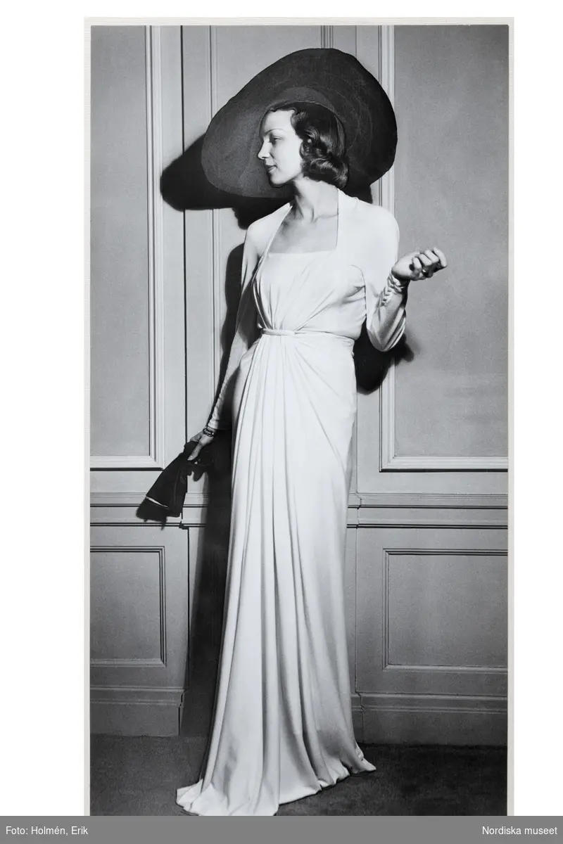 Mannekäng visar aftonklänning. Fyrkantig urringning, lång ärm med knäppning vid manschetten, liv och kjol rynkade mot midjan. Vidbrättad hatt. NK:s Franska damskrädderi våren 1938, från Maison Alix.