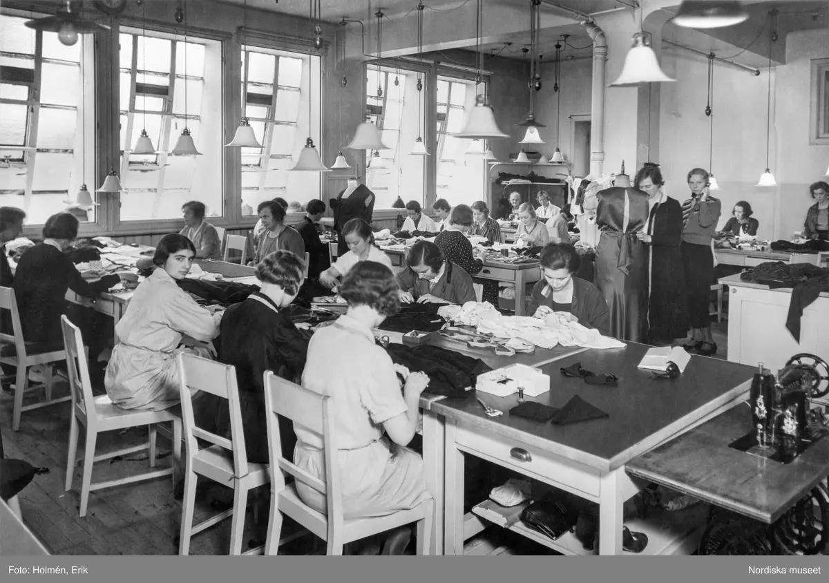 Interiör från NK:s Franska damskrädderi, syateljén vägg i vägg med visningssalongen på våningsplan fem. Sömmerskor arbetar vid långa bord, plagg provas på provdocka, en kvinna talar i telefonen. I förgrunden står en symaskin. Den mörkhåriga kvinnan som tittar in i kameran, tredje från höger närmast kameran, är sömmerskan