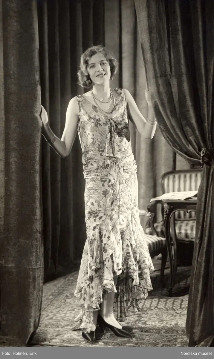 Blommig aftonklänning i flera längder. Nordiska Kompaniet.