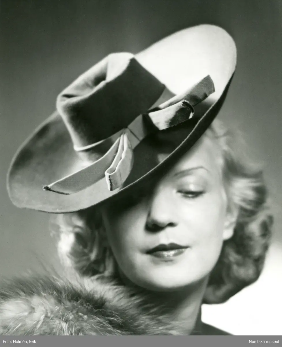 Porträtt av kvinna klädd i päls och hatt med ljust band.