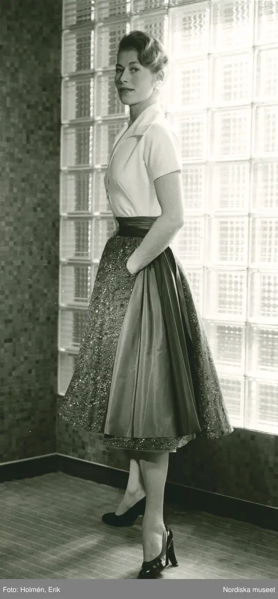 EM, Modellbutiken, Nordiska Kompaniet, Damkonfektion. Modell i vit blus, kjol med brodyr och sidenband, samt pumps, står framför vägg i betongglas.