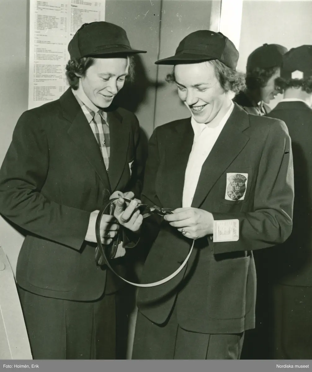 Två kvinnor i olympiska dräkter med kepsar, tittar på ett skärp.