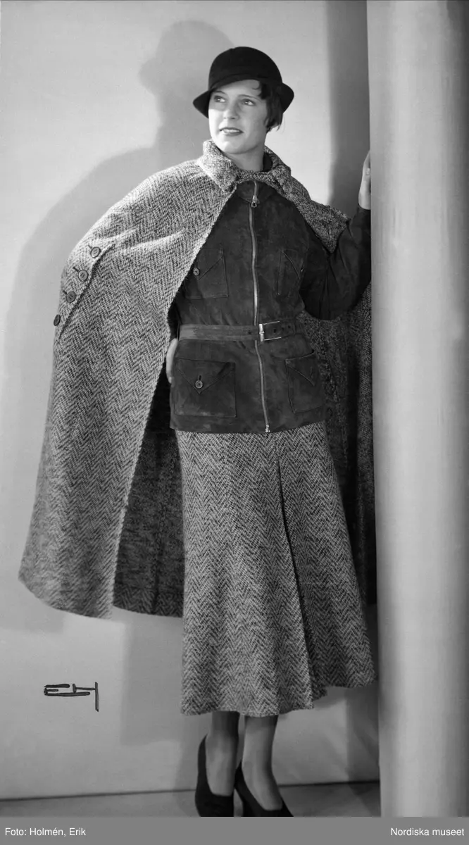 Modell poserar i kjol, jacka och cape. Nordiska Kompaniet.