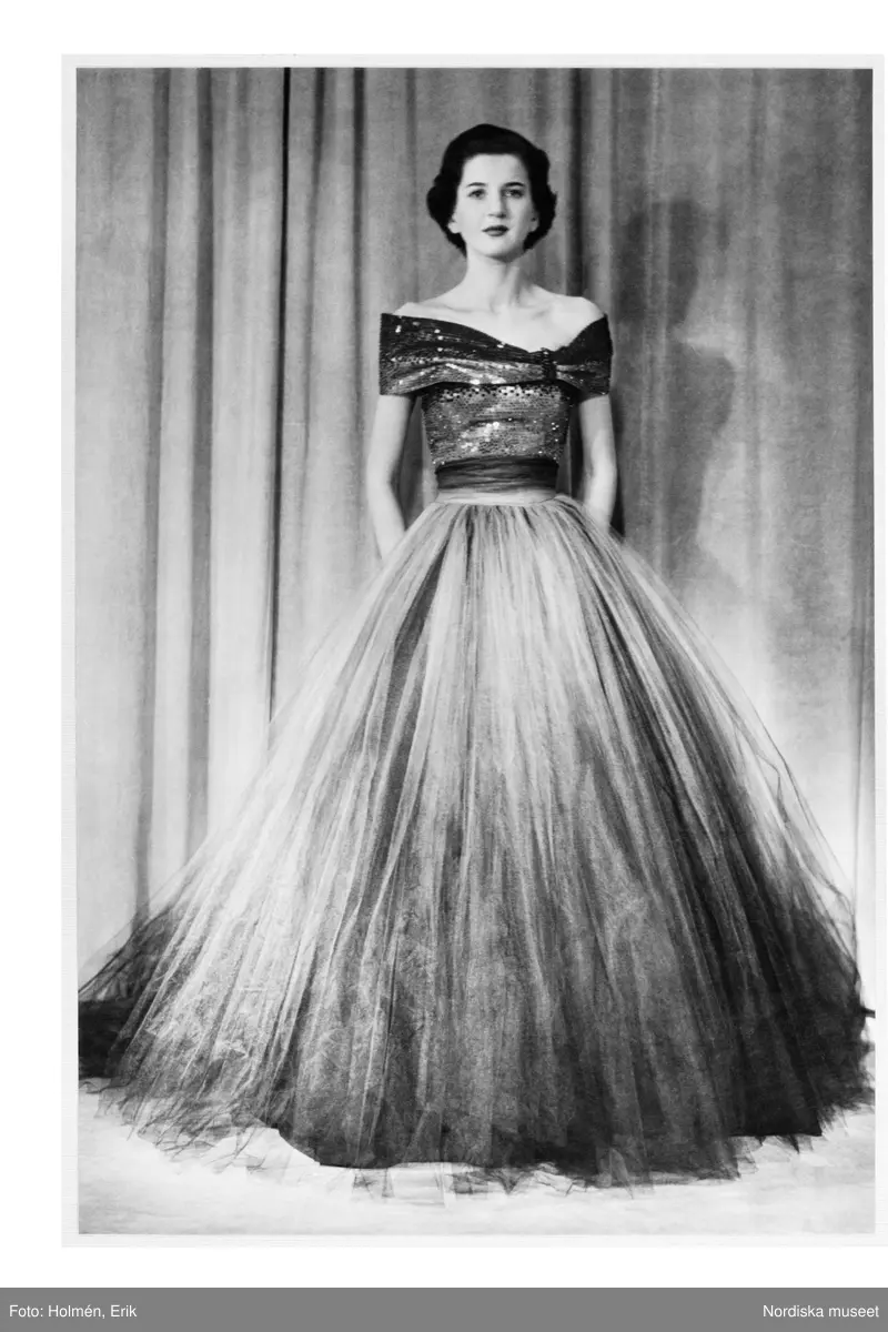 Mannekäng poserar i festplagg framför draperi i provrum vid NK:s Franska damskrädderi. Hellång klänning med urringning, liv dekorerat med paljetter, markerad midja, vid tyllkjol i flera lager med tonad färg.