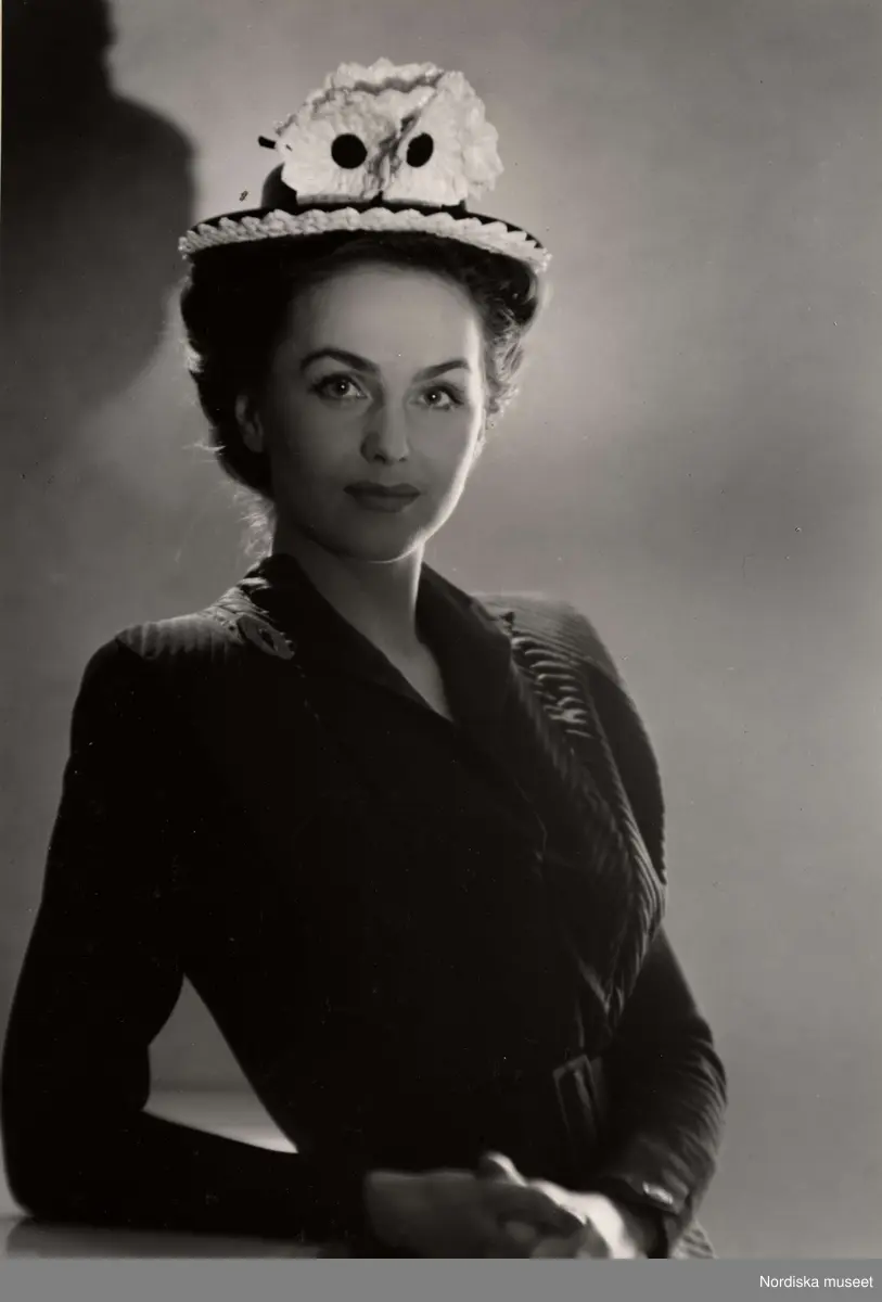 Kvinnlig modell i hatt med ljus kant och stora ljusa blommor. Dammode, Nordiska Kompaniet.