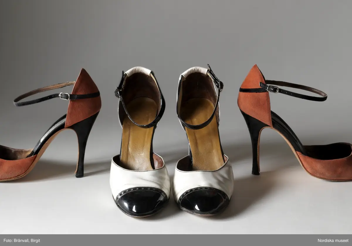 Tangoskor. Ett par damskor i ljusbrun mocka med hög klack, öppen tå och svart vristrem samt ett par högklackade damskor, vita med svart tå och vristrem.