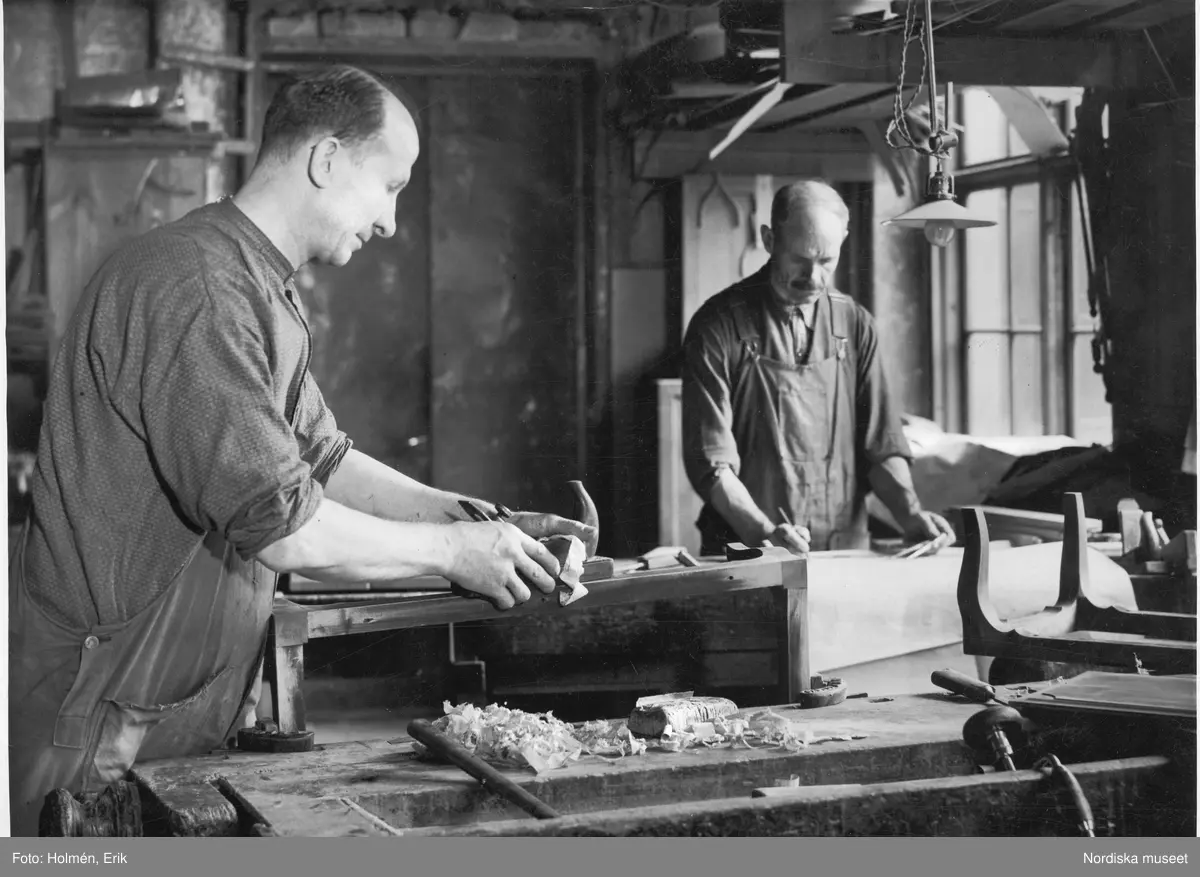 Möbelverkstäderna i Nyköping. Två män i snickeriet. Nordiska Kompaniet.