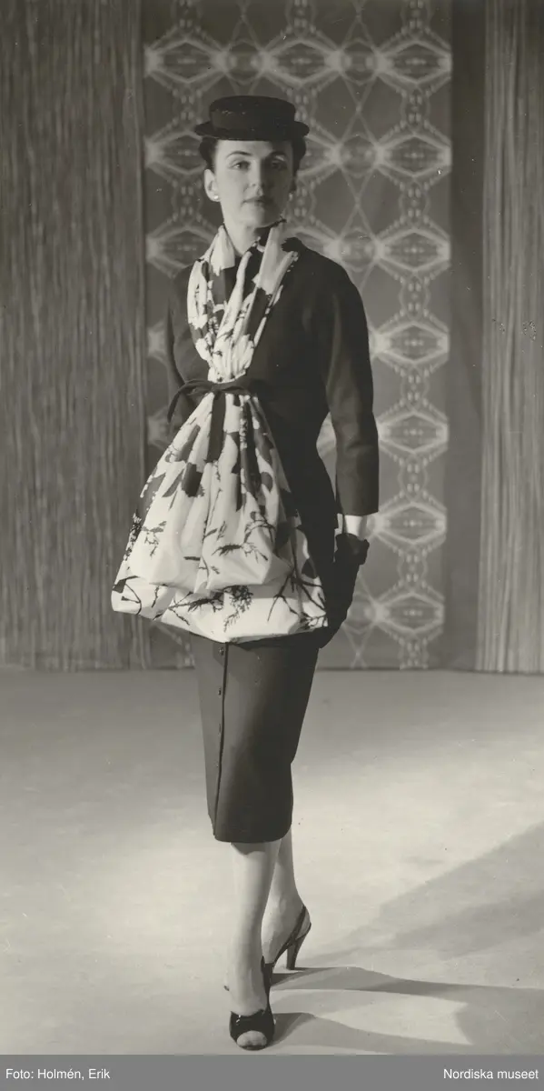 Modell i dräkt, hatt, handskar och vit mönstrad sjal. Från J. Fath.