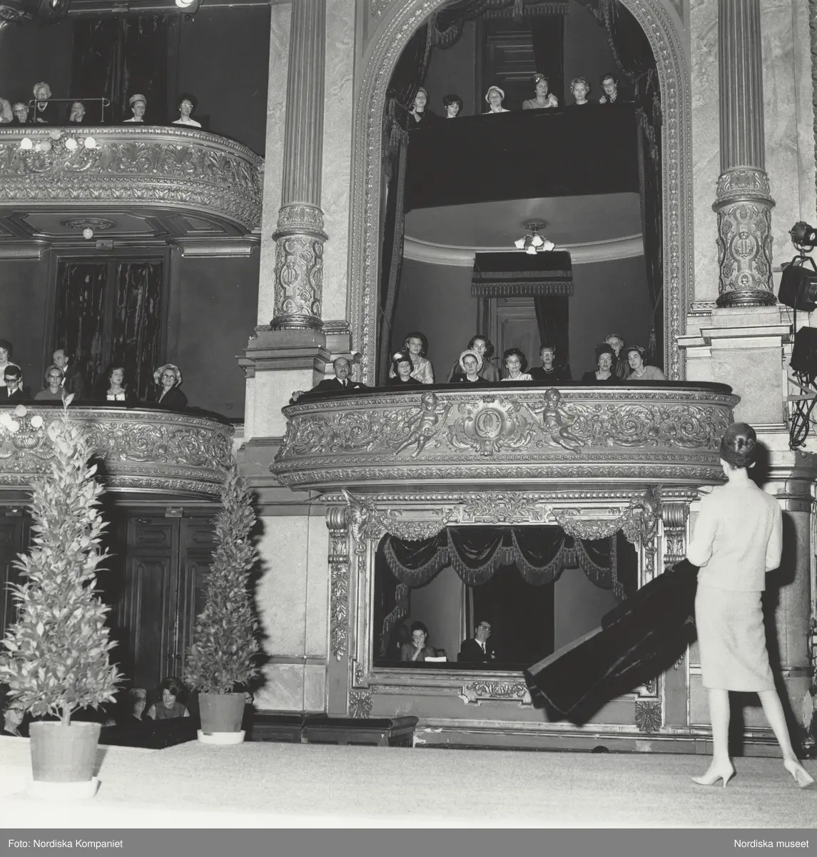 Modevisning på Stockholmsoperan, arrangerad av NK:s Franska damskrädderi. Mannekäng i dräkt från Balmain. På balkongerna sitter publik.