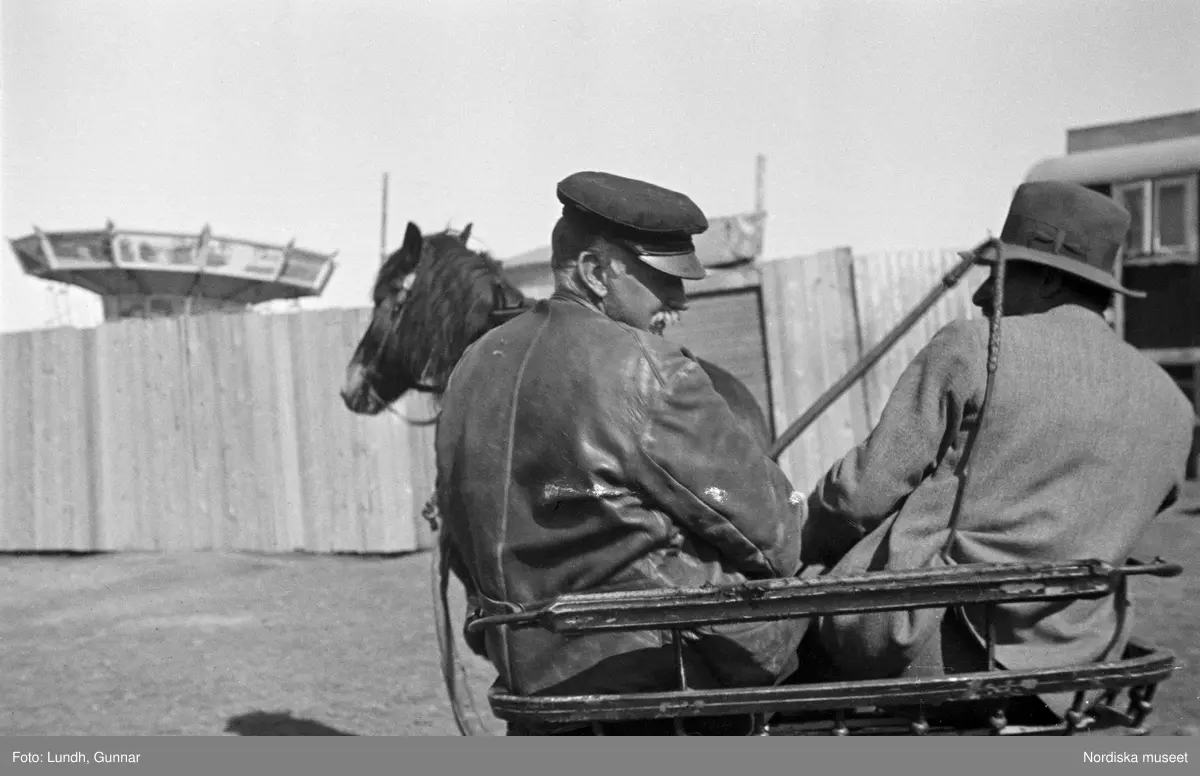 Bild av två män i vagn spänd bakom häst i familjenTaikons läger vid Johanneshov, södra Stockholm