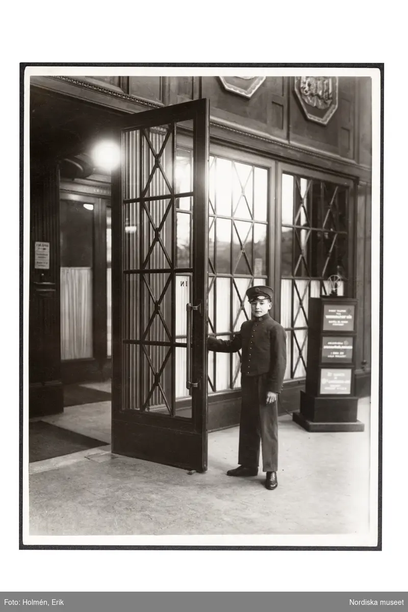 En pojke klädd i uniform öppnar dörren till Nordiska Kompaniets (NK) stora entré vid Hamngatan.