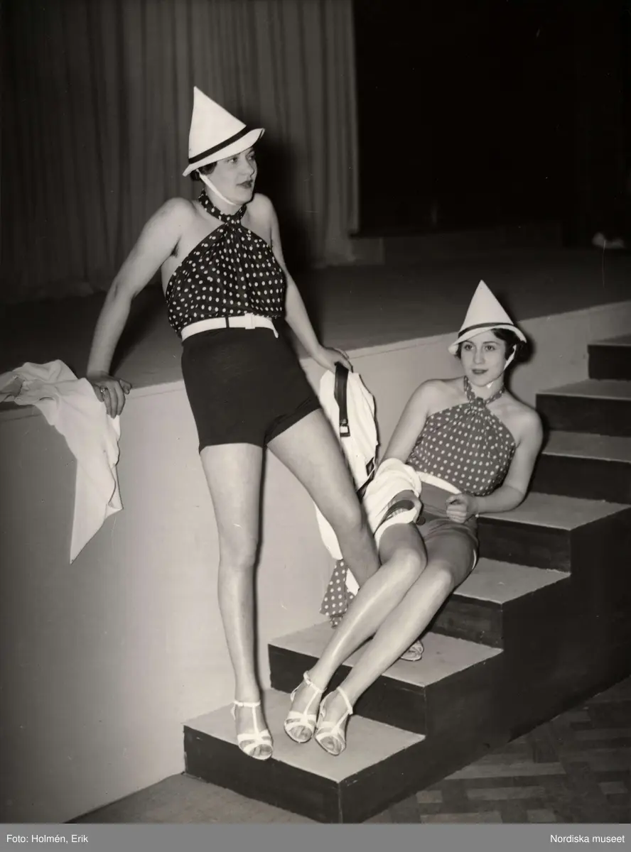 Två kvinnliga modeller i strandkläder, baddräkt. Wienermodeschan, januari 1934. Nordiska Kompaniet.