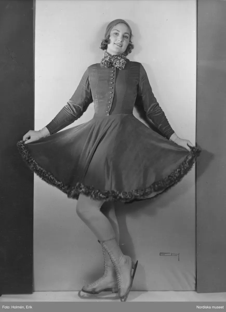 Dammode. Kvinnlig modell med skridskor. Nordiska Kompaniet.
