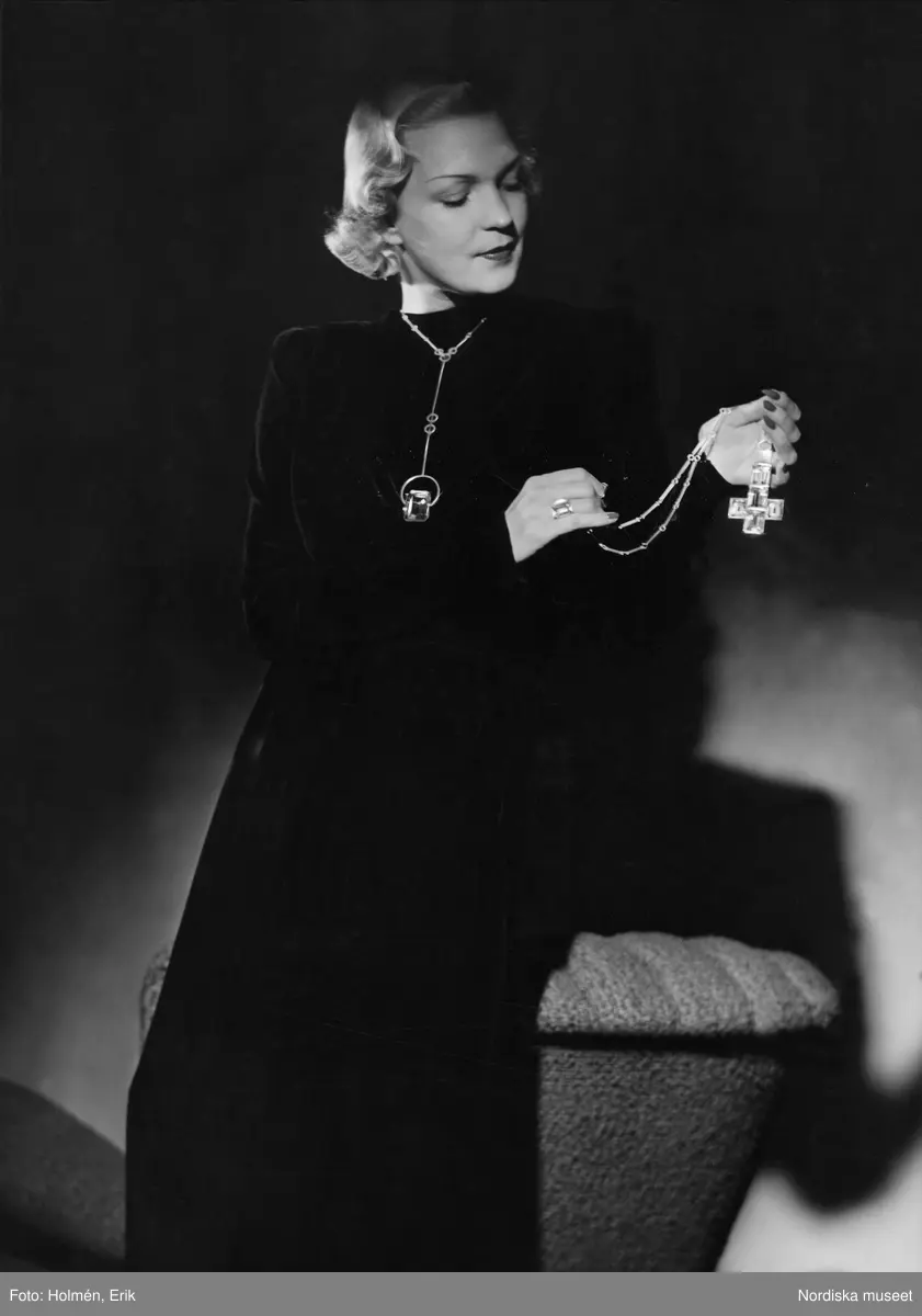 Dam visar silversmycken, ritade av Wiwen Nilsson, Nordiska Kompaniet.