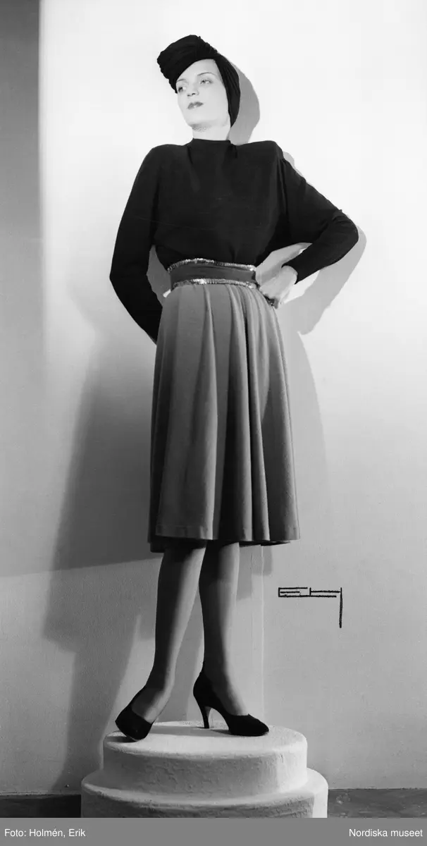 Modell i mörk överdel med pingvinärmar, midjelång kjol, pumps och turban. Modellen står på ett runt podie.