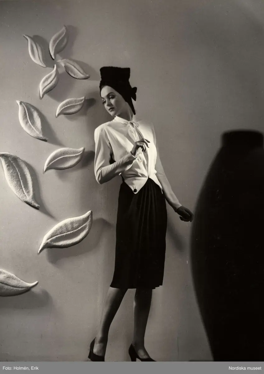Titel: Franska avdelningen på Nordiska Kompaniet 1944. Kvinnlig modell poserar i dramatisk ljussättning iförd tvådelad, tvåfärgad klänning med skört och knytband i halsen. På väggen bakom ett arrangemang med blad.