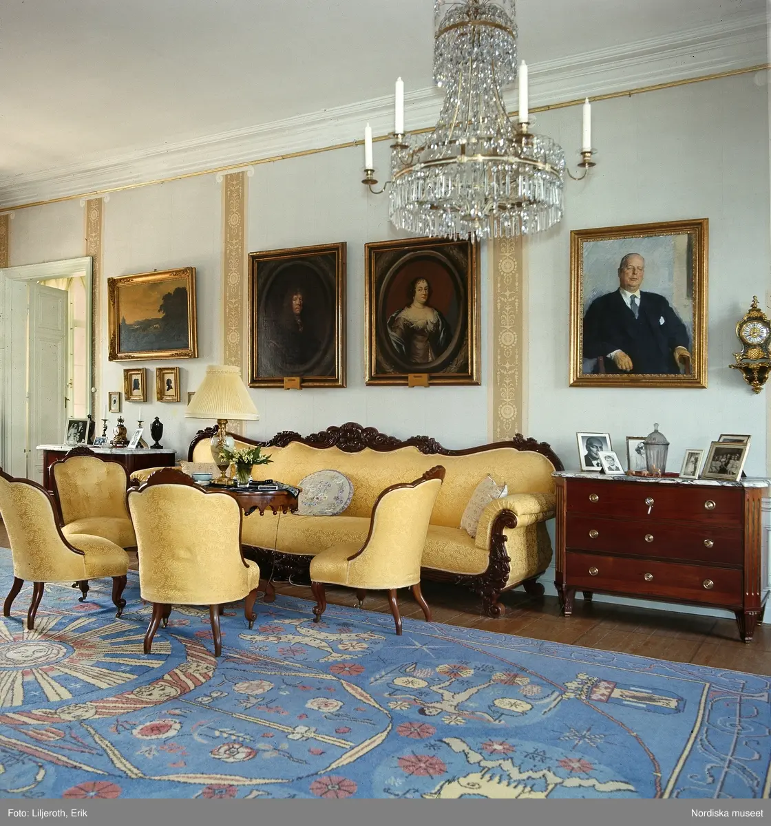 Interiör från Blekhem i Småland. Stora salongen med möbel i nyrokoko, matta vävd efter mönster av Maja Sjöström och Ehrenstrahlporträtt över soffan.