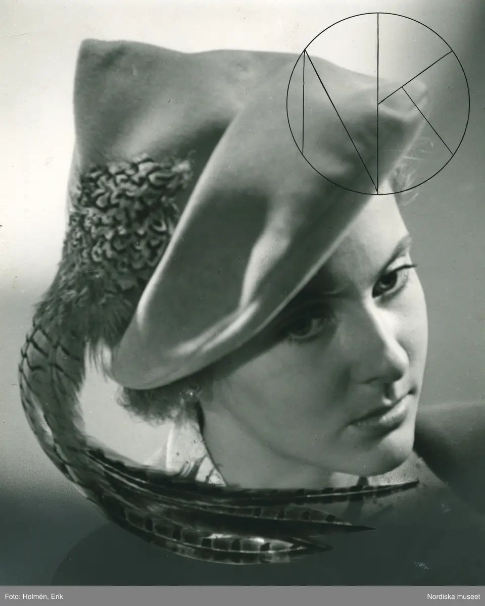 Titel: Porträtt av kvinna i senapsgul velourhatt med fasanfjädrar. Modell från Maison Gilbert Orcel.
