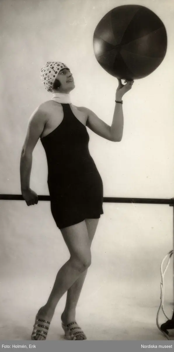 Kvinna med boll, iklädd baddräkt, badmössa och skor. Nordiska Kompaniet.