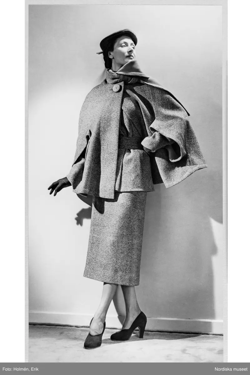 Mannekängen Margareta Berglund gift Nordlund (1946) poserar iklädd ytterplagg i provrummet på NK:s Franska damskrädderi. Stusslång jacka med brett skärp i samma tyg, vadlång pennkjol. Över detta bär hon en stusslång cape med draperad krage och knäppt med en stor knapp. Hatt, handskar och pumps.