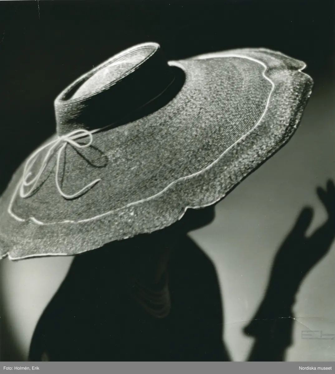 Porträtt av kvinna i blå stråhatt med vit sautage. Modell från Christian Dior.