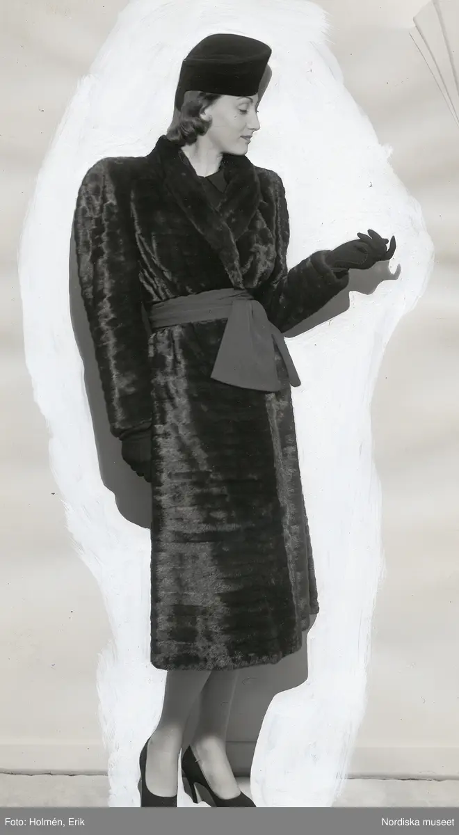 Nordiska Kompaniet. Kvinna i mörk, tvärrandad päls med brett tygskärp. Mörk hatt, mörka handskar.
