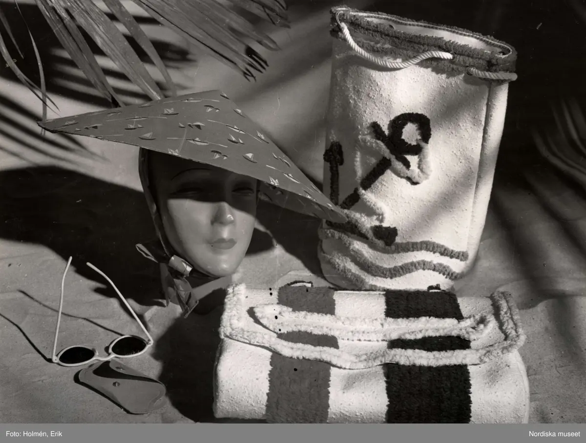 "Strandmode" skyltning på Nordiska Kompaniet 1939. I sanden står en strandväska, modell skeppssäck med ankare på, där ligger en randig badhandduk och ett par solglasögon. En skyltdocka, ett kvinnohuvud, är iförd en trekantig solhatt med båtmotiv.