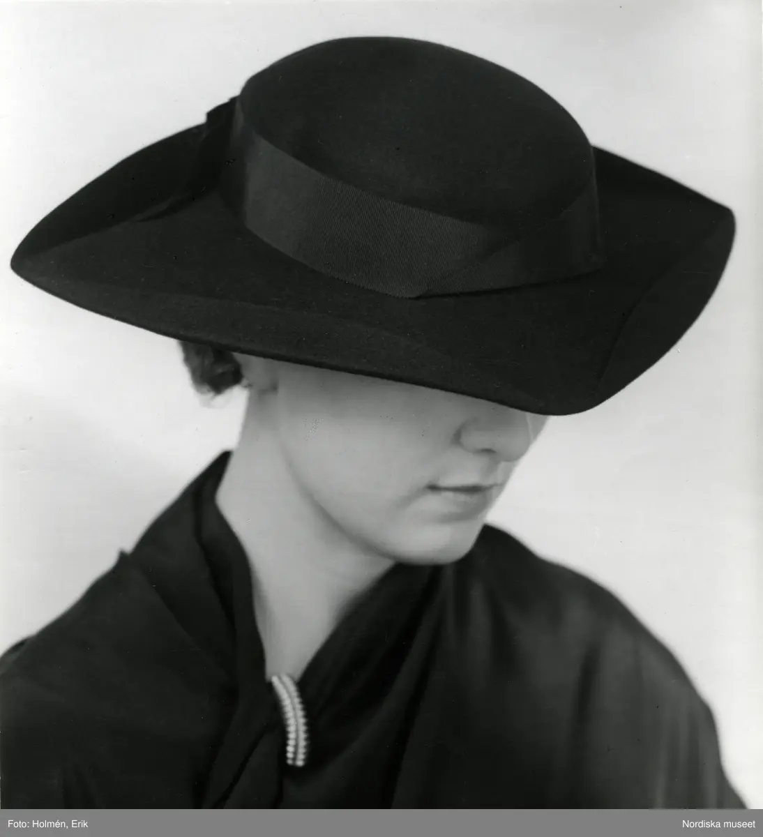 Kvinnlig modell i hatt från Rose Valois. Svart filt med ripsband. Nordiska Kompaniet, Stockholm.