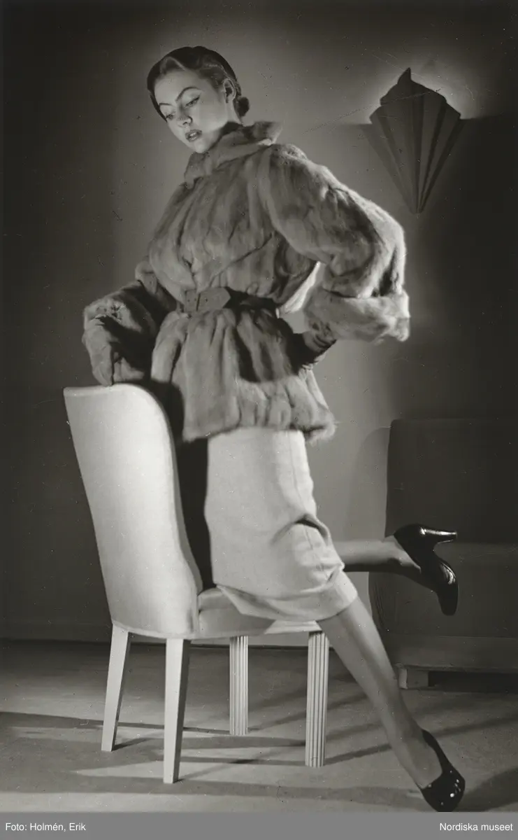 Nordiska Kompaniet. Kvinna i ljus pälsjacka med vida ärmar och skärp. Ljus, snäv kjol. Text på baksidan: "Nov 1950"
