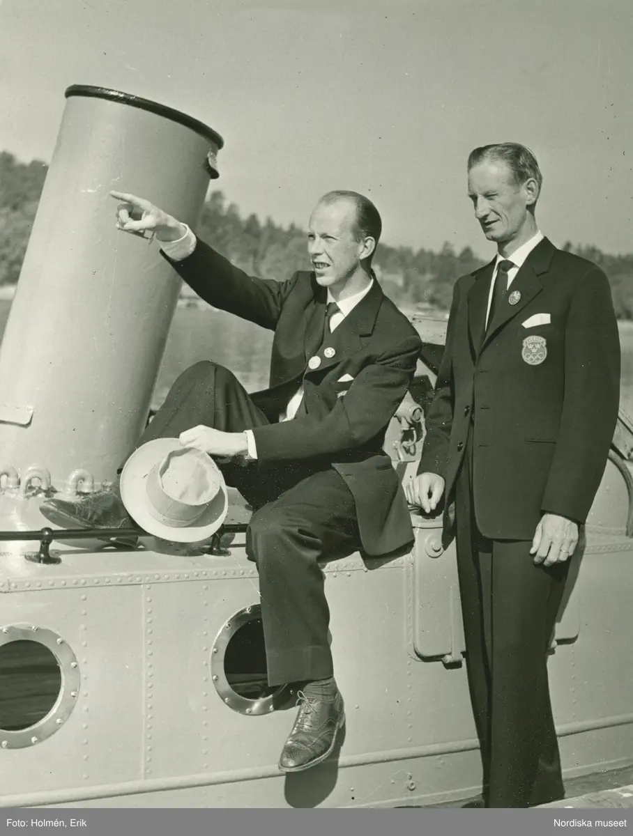 Två män på en kaj i olympisk dräkt beskådar horisonten.