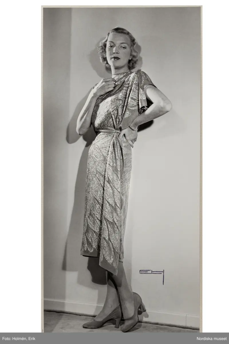 Mannekängen Margit Langlet poserar iklädd vadlång, mönstrad kortärmad klänning. Drapering vid axel och höft. Pumps med mellanhög klack. NK:s Franska damskrädderi.