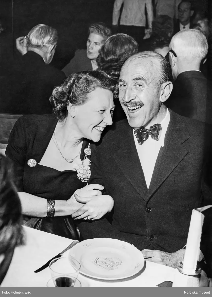 Nordiska Kompaniets (NK) jubileumsfest i Stockholms stadshus. Vid dukat bord sitter textilkonstnär Margit Graffman och Pelle Lundgren chef vid NK:s Franska damskrädderi festklädda. Båda skrattar.