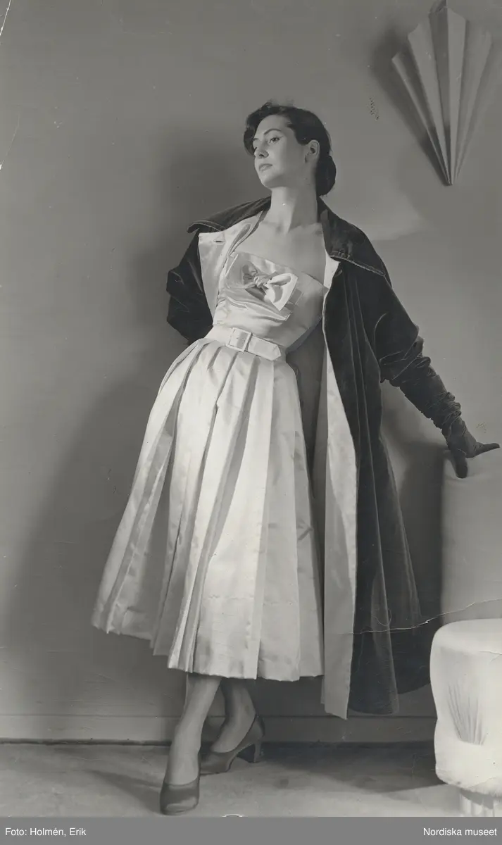 Modell i vit aftonklänning med rosett och skärp, sammetskappa, handskar och pumps.