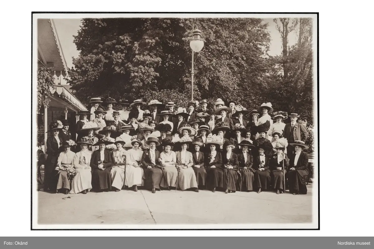 Ett grupporträtt av personalen på NK:s Franska damskrädderi på utflykt 1911. En grupp med sittande kvinnor i dräkt och hatt flankerade av några kostymklädda män. Den unge mannen längst bak, sjätte från vänster är Kurt Jacobsson, då nittonårig volontär hos Madame Suzanne.